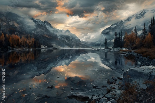 © AI Digital Artist, Naklejka premium Snowy alpine lake landscape with fog and wide mountain ranges