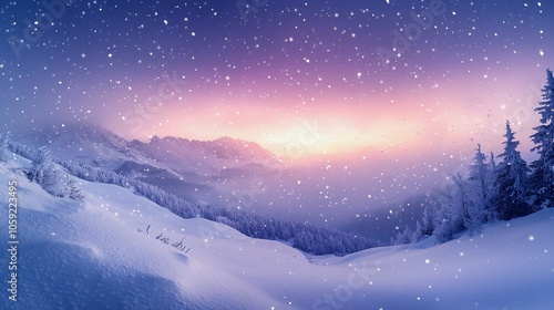© Kasivat, Naklejka premium Snowy Alpine Landscape at Twilight with Falling Snowflakes
