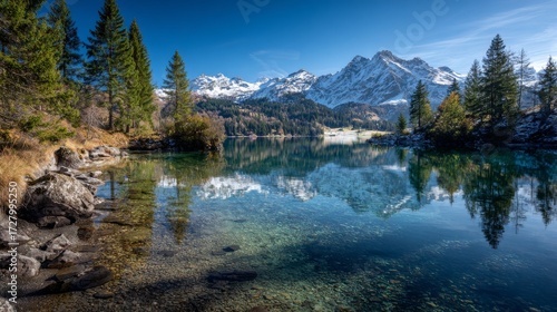 © Sebastian Visuals, Fototapeta premium Snowy alpine landscape with lake and mountain peaks under soft light, tranquil outdoor scene highlighting wilderness adventure, scenic nature travel, and the cultural charm of alpine exploration