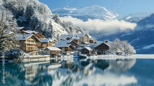 Fototapeta premium Snowy Alpine Village Reflected in Lake winter mountains