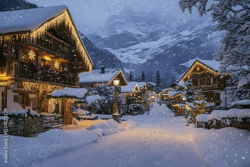 Naklejka premium Snowy alpine village with festive lights on cozy winter evening