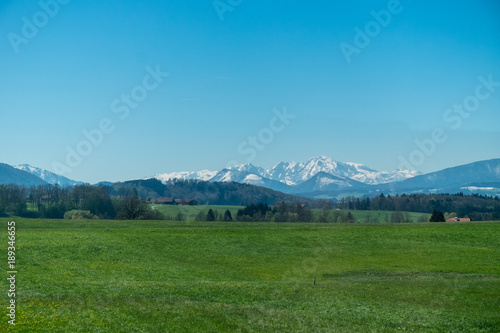 Fototapeta premium Snowy Alps mountains behind a green meadow