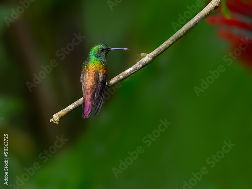© FotoRequest, Fototapeta premium Snowy-bellied Hummingbird sitting on stick on green background