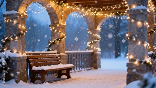 © Harper, Fototapeta premium Snowy bench under lit arches