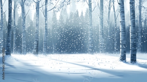 © Penatic Studio, Naklejka premium Snowy Birch Forest Winter Scene Softly Falling Snow