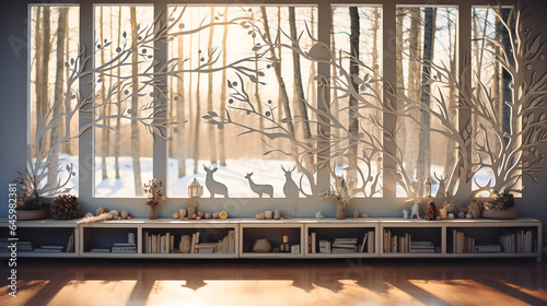© Nilima, Obraz premium Snowy birch tree cutouts on window ledges