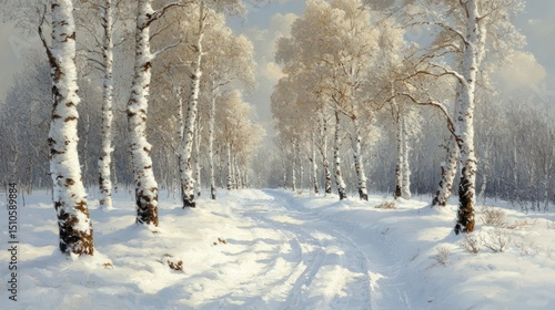 © RONNY, Obraz premium Snowy birch trees line a winter path