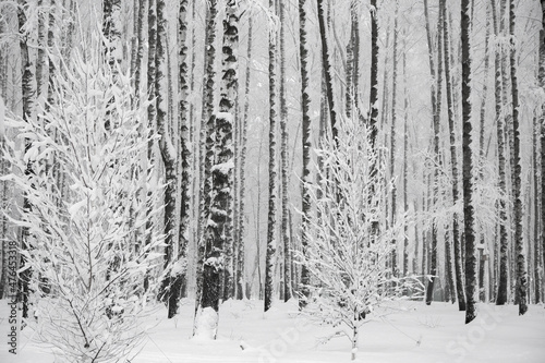 © Veronika Kiriushina, Fototapeta premium Snowy birches trees in forest, winter monochrome landscape