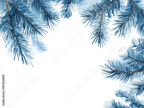 Obraz premium Snowy Blue Pine Branches on White Background