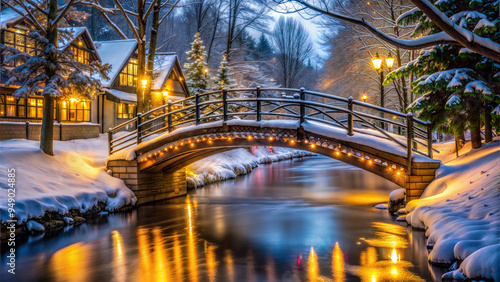 Obraz premium Snowy Bridge with Christmas Lights in Winter Park