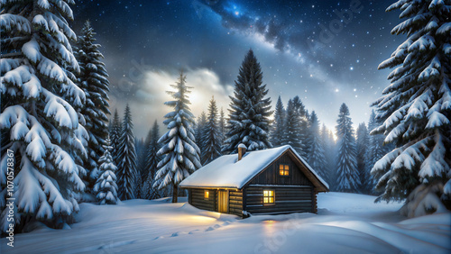 © Princess Turandot, Fototapeta premium Snowy cabin in pine forest with starry night sky on a cold winter evening