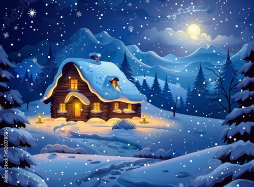 © duyina1990, Naklejka premium Snowy Cabin in the Mountains
