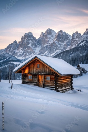 © haiqiang, Naklejka premium snowy cabin in the mountains with a mountain range in the background