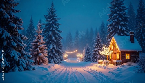 © Harfia, Fototapeta premium Snowy Cabin Winter Wonderland Night Scene with Lights