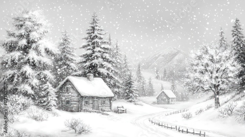 Naklejka premium Snowy cabins, winter wonderland, snow falling.