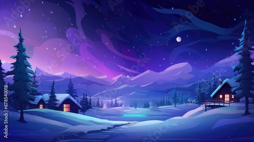 Fototapeta premium Snowy cartoon small village landscape background, concept art, digital illustration