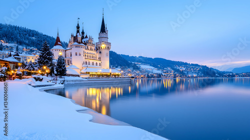 © PPS, Fototapeta premium Snowy Castle by a Lake at Twilight