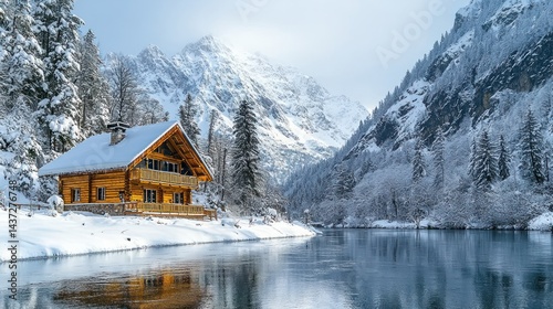 © RiaIndria, Fototapeta premium Snowy chalet by a frozen lake, mountain backdrop