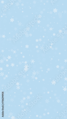 © Begin Again, Fototapeta premium Snowy christmas background. Subtle flying snow flakes and stars on light blue winter backdrop. Delicate sweet snowy christmas. Vertical vector illustration.