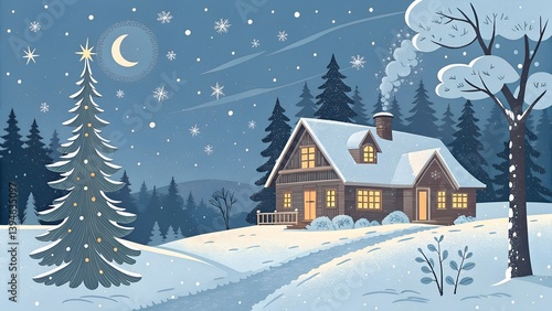 © picbox, Naklejka premium Snowy christmas eve with quaint cottage and tree. Stardrift. Illustration