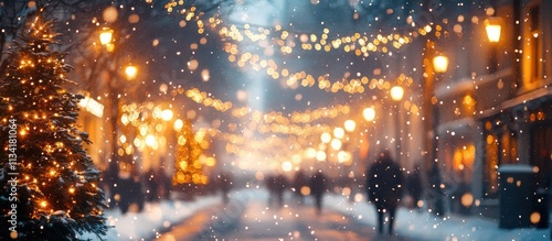 Fototapeta premium Snowy Christmas street scene at night with blurred lights and people.