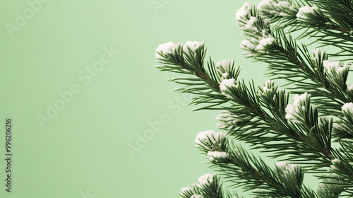 Obraz premium Snowy Christmas tree branches or snowy Christmas fir tree on a light lime background