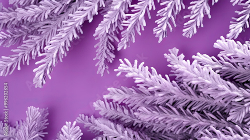 © darkredmon, Fototapeta premium Snowy Christmas tree branches or snowy Christmas fir tree on a violet background