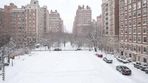 © kinara art design, Obraz premium Snowy city street scene with apartment buildings.