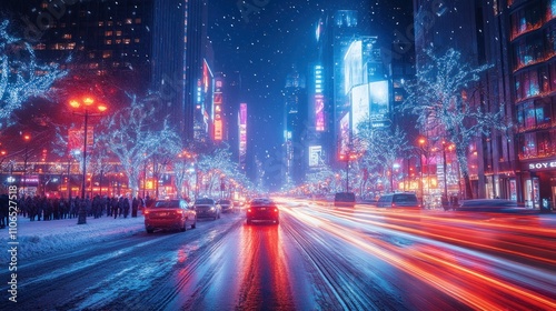 Fototapeta premium Snowy Cityscape at Night with Blurry Lights