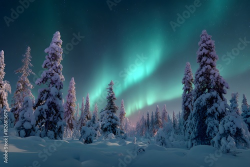 © Sandaru, Fototapeta premium Snowy countryside under shimmering green and purple aurora borealis above snow covered hills and trees serene winter holiday nightscape winter sunset in the mountains