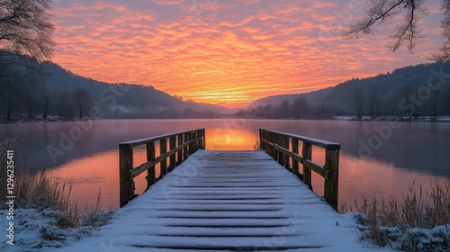 © Lemdah, Fototapeta premium Snowy dock sunrise lake winter calm landscape