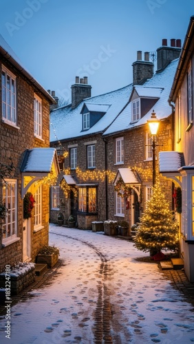 Fototapeta premium Snowy evening in quaint village with festive christmas decorations and warm...