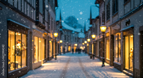 Fototapeta premium Snowy Evening on European Town Street with Blurred Shops and Lights