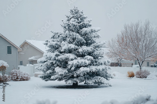 Naklejka premium Snowy Evergreen Tree in a Residential Yard winter spruce