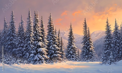 © Handz, Obraz premium Snowy Forest at Sunset with Mountain Peaks in the Background