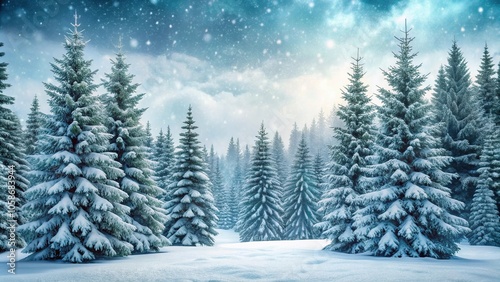 Naklejka premium Snowy forest landscape with towering evergreen trees and soft white snowfall, holiday scenery, frosty morning, natural beauty