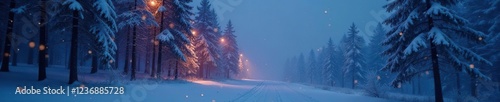 Naklejka premium Snowy forest landscape with twinkling lights and foggy atmosphere, glow,...