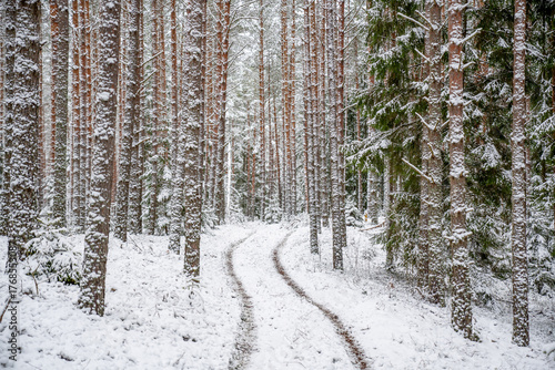 © alexugalek, Fototapeta premium Snowy Forest Path in Winter