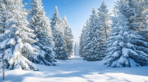 © ADIFERI, Naklejka premium Snowy forest path under clear sky
