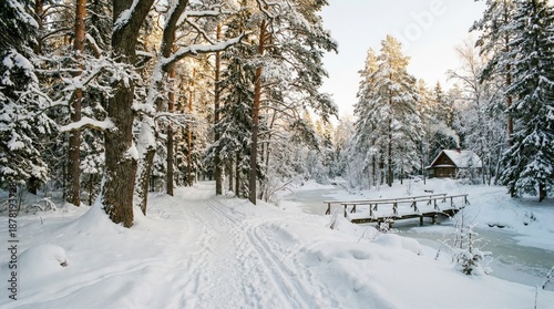 Fototapeta premium Snowy forest path with a bridge and cabin.