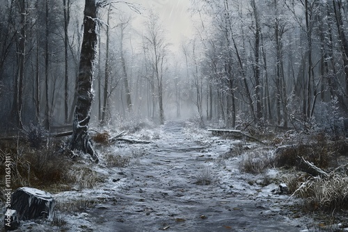 Fototapeta premium Snowy forest path with bare trees and foggy atmosphere.