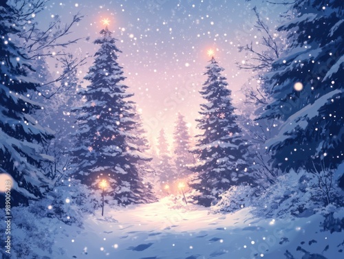 Naklejka premium Snowy Forest Path with Christmas Lights at Twilight