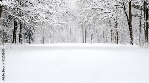 Fototapeta premium Snowy forest path with falling snow and tranquil atmosphere