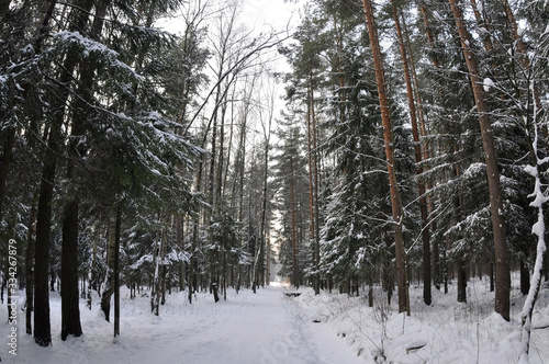 Fototapeta premium Snowy forest road among tall pines and other trees, wide angle photo