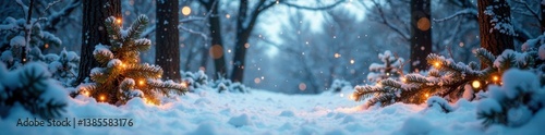Fototapeta premium Snowy forest scene with Christmas decorations, Christmas Tree, Holiday Village