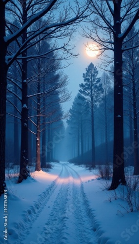© Kachaphot, Naklejka premium Snowy forest with bare trees and snow-covered ground, illuminated by soft moonlight, snowy woods, snow