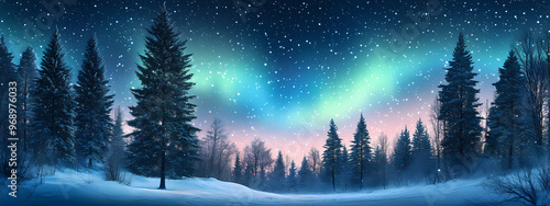 © Manuel, Fototapeta premium Snowy Forest with Bright Aurora