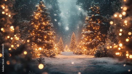 © Phoenix AI Photo, Fototapeta premium Snowy forest with illuminated Christmas trees and soft falling snow.