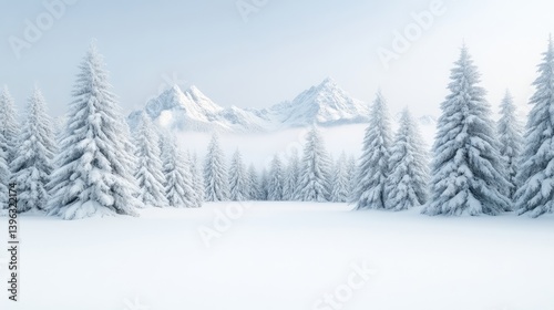 Fototapeta premium Snowy Forest with Mountains Serene Winter Landscape High Resolution Panoramic View Pristine Snow Peaceful Scene Winter Wonderland Cold Blue Tones Ideal for Holiday Cards