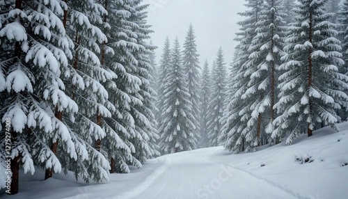 © Mityarko, Naklejka premium Snowy forest with tall pines and dirt road